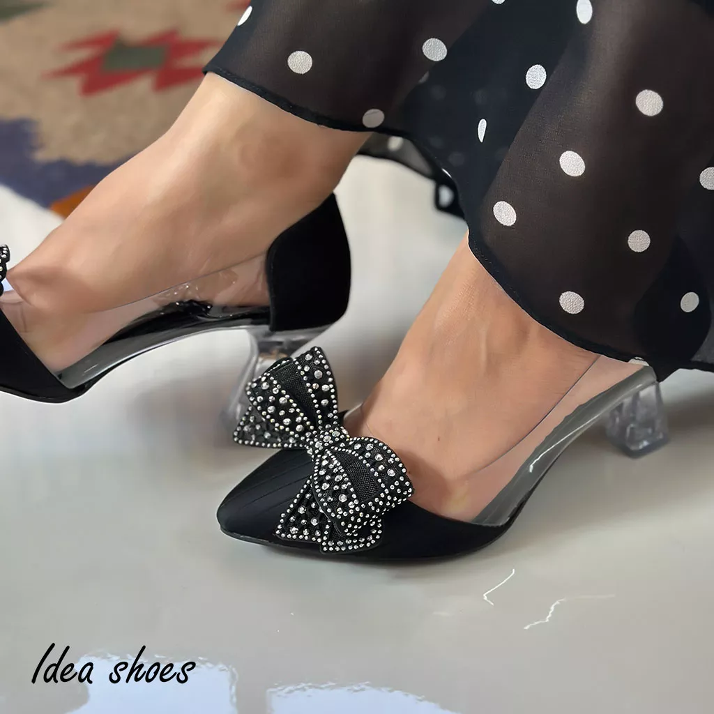 کفش مجلسی دخترانه با پاشنهٔ ۵ سانت کد ۶۳۵، با پاشنه ۵ سانت، طراحیشده از ساتن خطی و زیره دافوس، در رنگ مشکی و قالب استاندارد. با اتصال زیره به رویه از طریق چسب و پرس و وجود پاپیون خارجی، مناسب برای مجالس و مراسم رسمی، با تمیزکاری آسان با دستمال نم دار.»