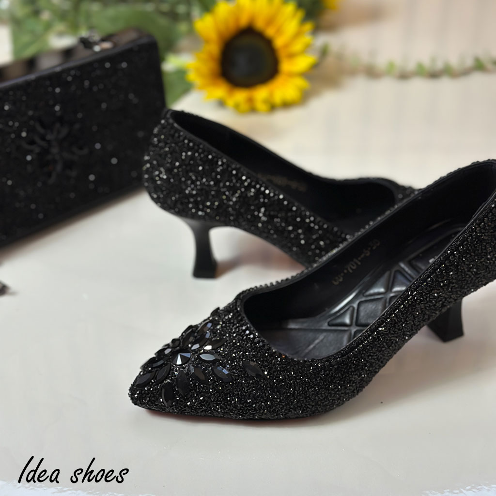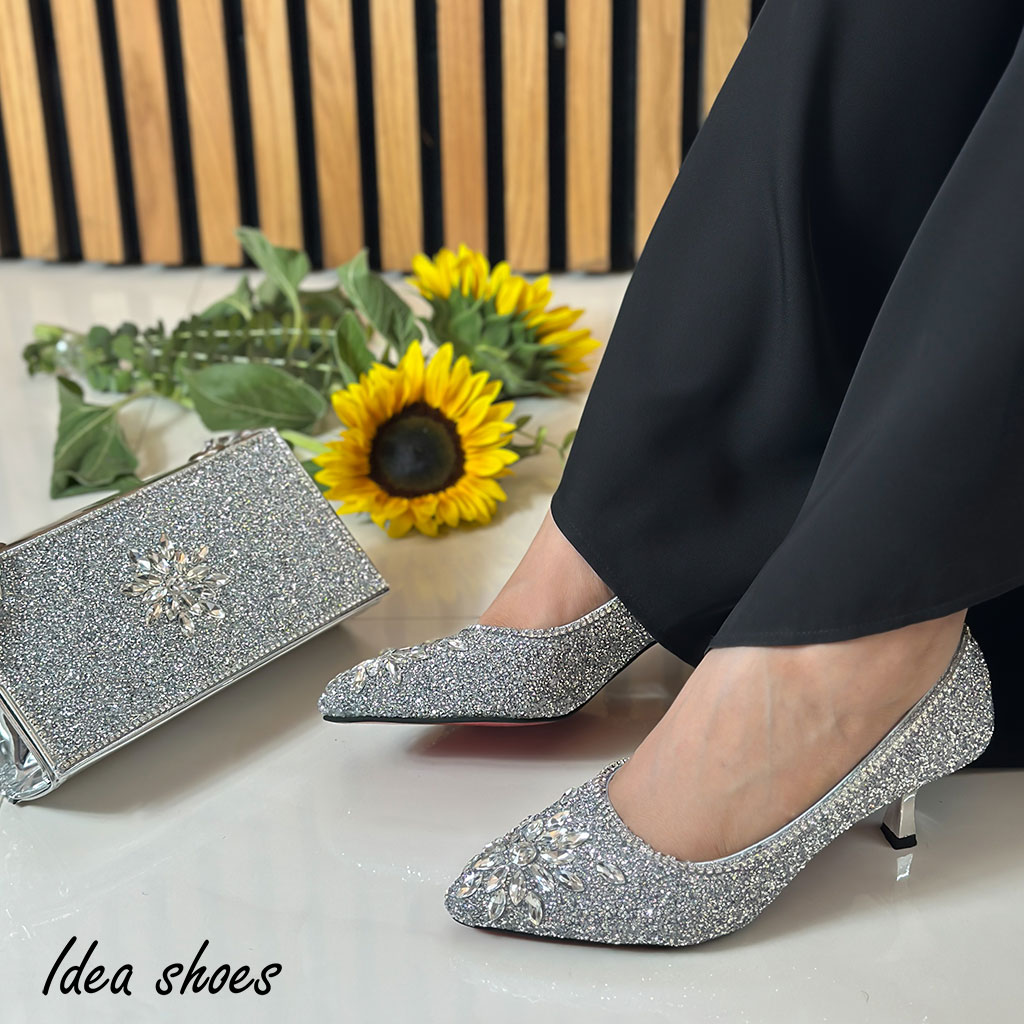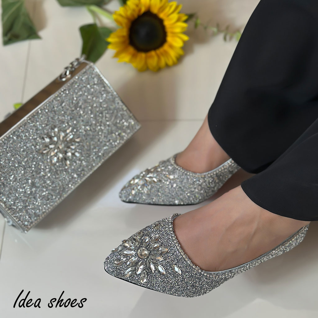 کفش مجلسی نگینی کد 703 از برند ایده، با رویه‌ای تمام‌نگینی و تزئین‌شده با سنگ‌های مرواریدی درخشان، طراحی لوکس و جذابی را برای رویدادهای ویژه ارائه می‌دهد؛ این مدل در رنگ‌های مشکی و نقره‌ای و سایزهای 36 تا 41 تولید شده و دارای لژ کار 5 سانتی‌متری همراه با زیره‌ی نرم دافوس است که زیبایی را با راحتی ترکیب می‌کند.