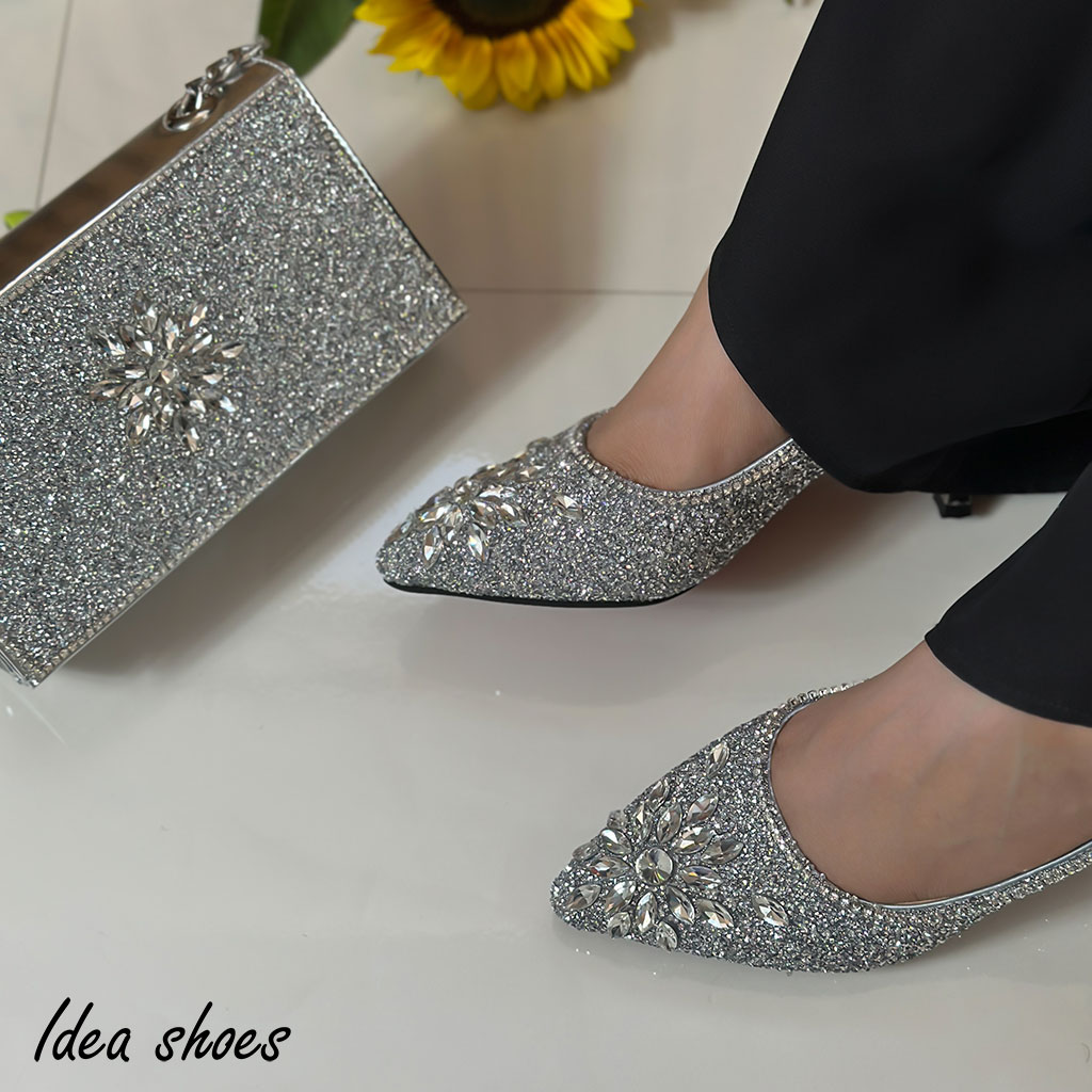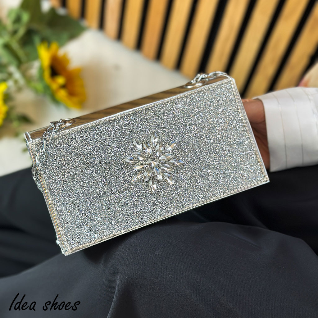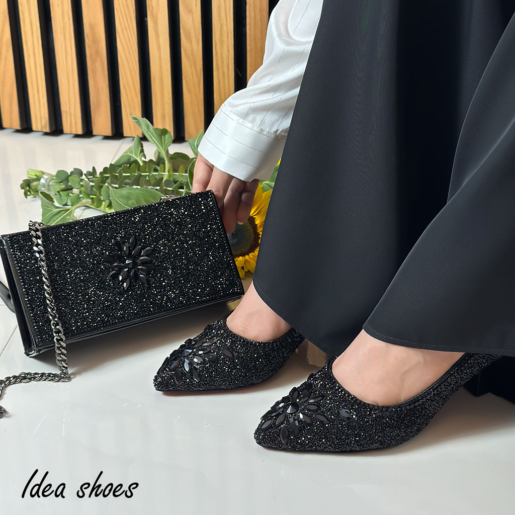 کفش مجلسی نگینی کد 703 از برند ایده، با رویه‌ای تمام‌نگینی و تزئین‌شده با سنگ‌های مرواریدی درخشان، طراحی لوکس و جذابی را برای رویدادهای ویژه ارائه می‌دهد؛ این مدل در رنگ‌های مشکی و نقره‌ای و سایزهای 36 تا 41 تولید شده و دارای لژ کار 5 سانتی‌متری همراه با زیره‌ی نرم دافوس است که زیبایی را با راحتی ترکیب می‌کند.