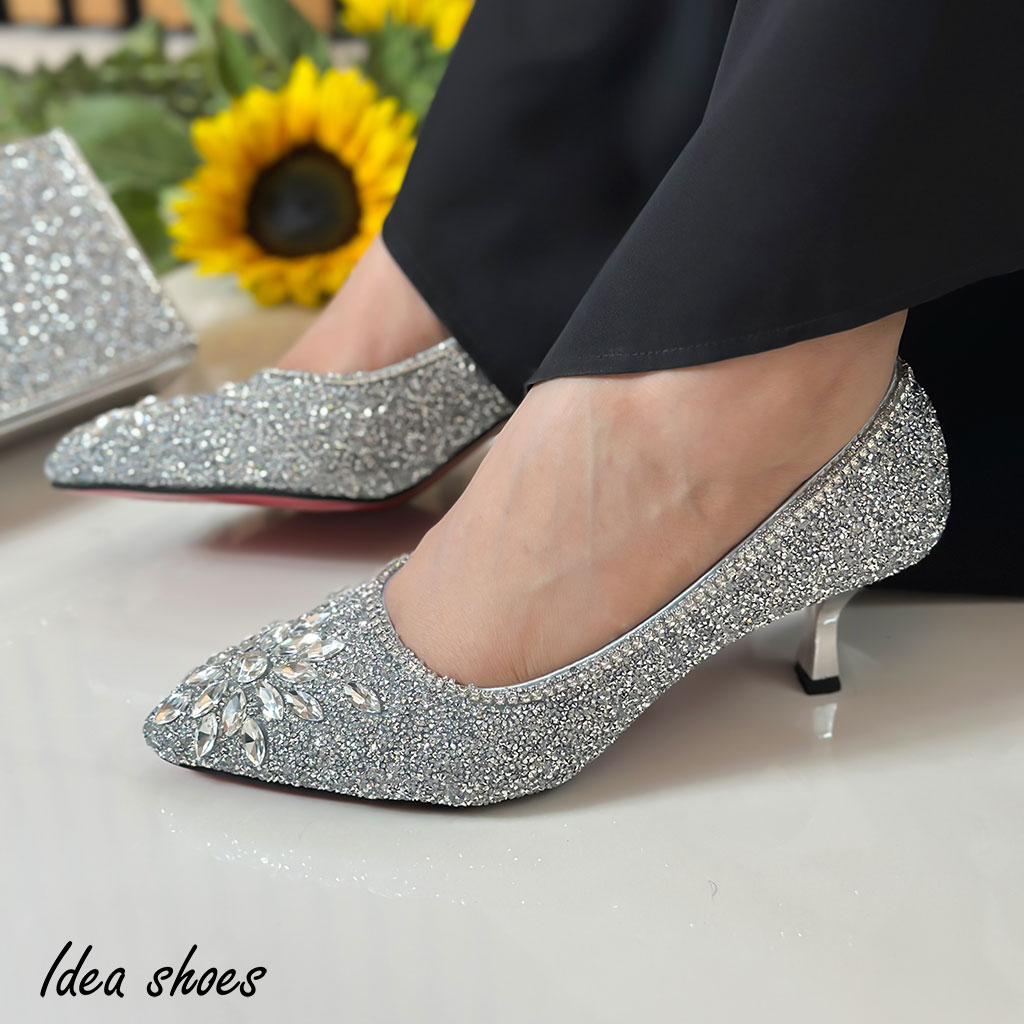 کفش مجلسی نگینی کار شده با سنگ مرواریدی کد 703 دارای رویه تمام نگینی می‌باشد.